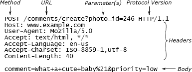 Figure 5.1: A POST request in the HTTP protocol consists of text sent over a TCP socket. Each request contains an initial line, a collection of headers terminated by an empty line, and an optional body. The initial line contains the request type (POST is used for submitting form data), a URL indicating an operation (/comments/create) and optional parameters (photo_id has the value 246), and the HTTP protocol version used by the sender. Each header line consists of a name such as Content-Length followed by its value. For this request, the body contains additional parameters (comment and priority).