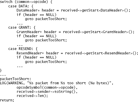 Figure 9.1: This code processes incoming network packets of different types; for each type, if the packet is too short for that type, a message gets logged. In this version of the code, the LOG statement is duplicated for several different packet types.